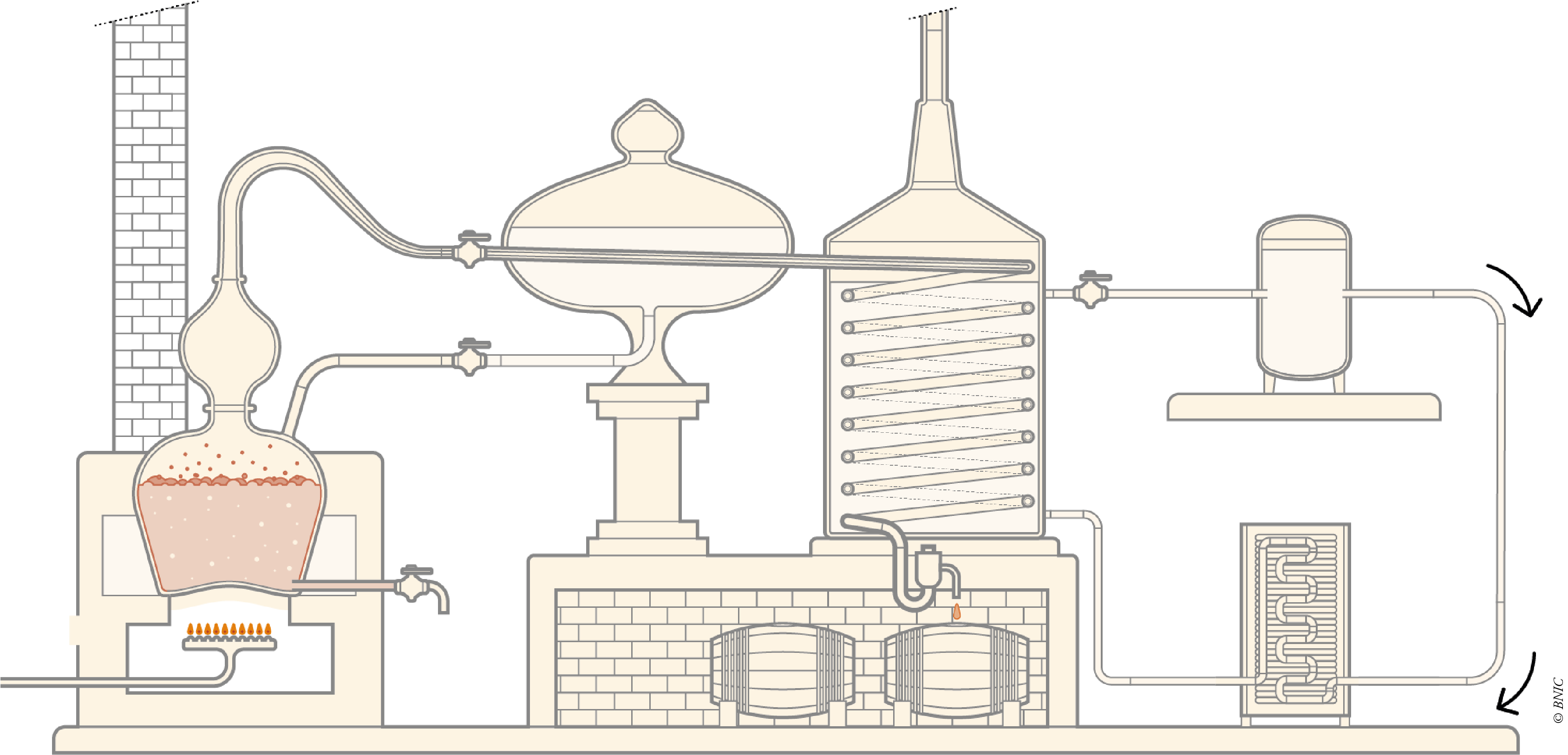 The "Charentais" alembic consists of a boiler heated over an open fire, a hood, a gooseneck, with or without a wine heater, and a coil with a cooling device.